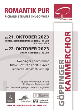 Unter dem Motto Romantik pur musiziert der Göppinger Kammerchor Werke aus den 1880er-Jahren von Richard Strauss und Hugo Wolf. Beide Komponisten begründeten in diesen Jahren ihren Ruhm als Tondichter. Unter Leitung von Leonard Hölldampf singt der Göppinger Kammerchor die Sechs Geistlichen Lieder von Hugo Wolf und die Acht Lieder (Opus 10) von Richard Strauss begleitet von Ulrike Gottlebe-Ebert am Klavier.Ergänzt wird das Programm um die von Ulrike Gottlebe-Ebert solo am Flügel vorgetragenen Stücke: Rhapsodie h-Moll von Johannes Brahms und den Walzer As-Dur von Chopin.