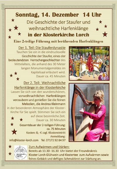 Lassen Sie sich von den wunderschönen, vorweihnachtlichen Harfenklängen verzaubern und genießen Sie die feinen Melodien, die Andrea Kleinmann in der besonderen Atmosphäre der Klosterkirche für Sie spielt.