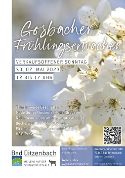 Am Sonntag, 07. Mai 2023 wird in Gosbach das Frühlingserwachen mit einem verkaufsoffenen Sonntag gefeiert. Zahlreiche Geschäfte rund um die Drackensteiner Straße 105 öffnen von 12 bis 17 Uhr ihre Türen.