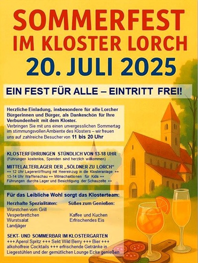 Am Sonntag, den 20. Juli 2025, lädt das Kloster Lorch von 11 bis 20 Uhr herzlich zum großen Sommerfest ein – mit freiem Eintritt für alle Besucherinnen und Besucher. Ein buntes Programm für die ganze Familie, Führungen durch das Kloster, kulinarische Genüsse und ein besonderes Highlight erwarten die Gäste: Das authentische Mittelalterlager der „Söldner zu Lorch“, das bereits am Samstag, den 19. Juli, im Kloster eröffnet wird.
