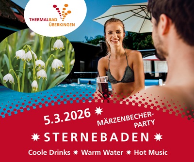 Am Donnerstag, den 5. März 2026, lädt das ThermalBad Überkingen ab 18:00 Uhr wieder zum beliebten Sternebaden ein. Freuen Sie sich auf einen besonderen Abend: Entspannen Sie im warmen Thermalwasser unter funkelnden Sternen, genießen Sie Hot Music für gute Laune, coole Drinks und die frühlingshafte Atmosphäre der Märzenbecher.