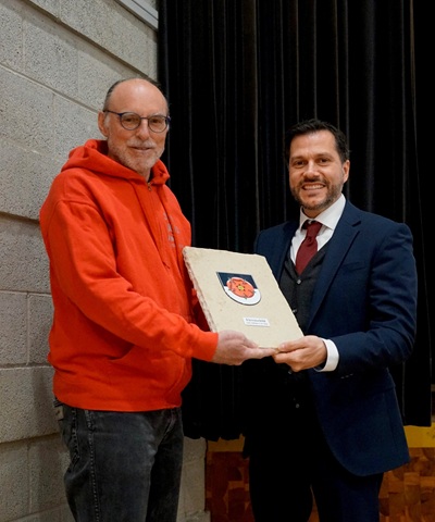 Fotos (Stadtverwaltung Geislingen an der Steige / Christiane Wehnert): oben: Oberbürgermeister Ignazio Ceffalia (rechts) übergab ein Ehrenschild an Stadtrat Jürgen