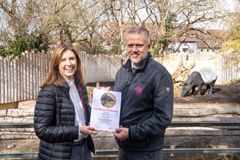 Ende Februar 2025 bekam der Zoologisch-Botanische Garten Stuttgart Besuch aus dem Rheinland. Nadine Grund, die Inhaberin des in Düsseldorf ansässigen Unternehmens Grund Coaching war eigens angereist, um ihren neuen Patentieren zu begegnen: Nämlich den Schabrackentapiren in der Wilhelma. Direkt vor der Anlage der südostasiatischen Tierart nahm Nadine Grund ihre Patenschaftsurkunde von Volker Grün, einem der beiden stellvertretenden Direktoren der Wilhelma, persönlich in Empfang.