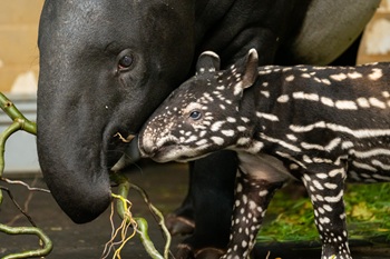 Schabrackentapire gelten in ihrer natürlichen Heimat, den tropischen Wäldern in Malaysia, Myanmar, Thailand und auf der indonesischen Insel Sumatra als stark gefährdet. Die Weltnaturschutzunion IUCN geht von nur noch 2.500 erwachsenen Tieren aus. Aufgrund von Lebensraumzerstörung und illegaler Bejagung geraten die mittlerweile oft zersplitterten Teilpopulationen immer mehr unter Druck. Umso wichtiger ist es, dass Zoos eine Verantwortung für die Art übernehmen, indem sie Reservepopulationen in menschlicher Obhut bewahren und weiterentwickeln. Die Geburt des Schabrackentapirkalbs Melati im Oktober 2024 in der Wilhelma war in diesem Zusammenhang ein aufsehendes Ereignis für die Zoowelt. Wilhelma-Direktor Dr. Thomas Kölpin, der gleichzeitig Kurator für die Schabrackentapire ist, verrät, warum: „Das Ex Situ-Zuchtprogramm des europäischen Zooverbands EAZA umfasst nur rund 50 Exemplare dieser charismatischen Art. Darum ist jedes einzelne geborene Tier so ungeheuer wichtig.“
