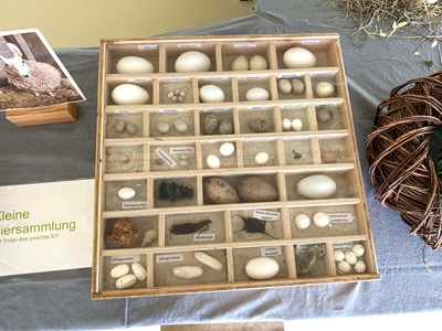 Eine große Sammlung zeigt, wie unterschiedlich Eier aussehen können: Von ovalen bis fast kreisrunden, von weißen über gesprenkelte bis hin zu bräunlichen Vogeleiern. Das Team der Wilhelmaschule erklärt, dass nicht nur Vögel Eier legen, sondern auch viele andere Tiergruppen, wie Fische, Amphibien, Reptilien und Insekten. Die Sammlung enthält daher Eier von Haien und Rochen, Krokodilen, Schlangen, Stabschrecken und Gottesanbeterinnen. Wer genau hinschaut, findet das in der Sammlung gut versteckte Marzipan-Ei des Osterhasen. Einen anderen Schwerpunkt bilden die Themen Landwirtschaft und Hühnerhaltung. Es wird darüber aufgeklärt, wo unser Frühstücksei herkommt, welche Hühnerrassen es gibt, wie sie gehalten werden und worauf Tierfreundinnen und Tierfreunde beim Eierkauf achten sollten.