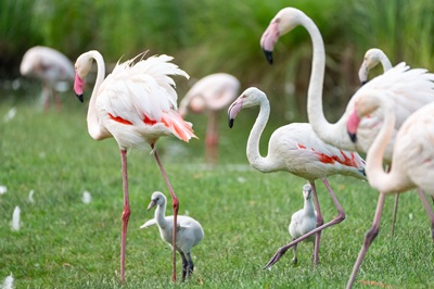 Rosaflamingos fühlen sich nur in Gesellschaft wohl: Auch in der Natur brüten sie daher kolonieweise. Als Nistplatz häufen Sie im flachen Wasser einen Schlammhügel auf, in den sie eine Mulde formen, in welche in der Regel ein Ei gelegt wird. Nach gut vier Wochen Brutzeit schlüpfen die Küken, deren Körper noch von einem dichten, weißen Dunenkleid bedeckt ist. Gefüttert werden sie von beiden Altvögeln mit einer speziellen Kropfmilch. Ab einem Alter von rund 10 Tagen schließen sich die Jungvögel zu einer so genannten „Crêche“ zusammen – einem Kindergarten. Dieses Phänomen ist jetzt auch in der Wilhelma wieder gut zu beobachten. Obwohl die Jungvögel nun eine eigene Gruppe bilden, werden sie von ihren jeweiligen Eltern weiter gefüttert. Anhand ihrer Rufe können die Altvögel ihren Nachwuchs erkennen, selbst in großen Kolonien, die in der Natur eine fünfstellige Anzahl von Jungvögeln umfassen können. Die kleinen Flamingos wachsen schnell: Im Alter von sechs Wochen sind sie nahezu ausgewachsen und ihr Gefieder voll entwickelt. Das kräftige Rosa an den Beinen, am Schnabel und in Teilen des Gefieders zeigt sich aber erst nach mehreren Jahren.