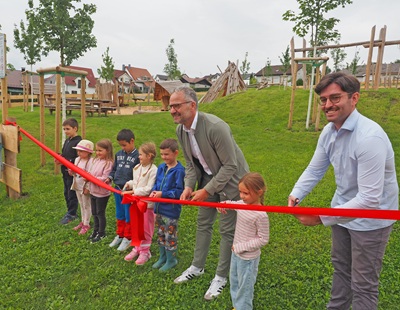 Foto (Stadt Uhingen): Ortsvorsteher Vincent Krapf (rechts) und Bürgermeister Matthias Wittlinger eröffnen den neuen Spielplatz mit tatkräftiger Unterstützung einiger Kindergartenkinder.