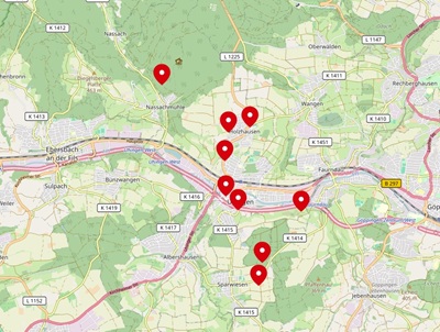 7 Apfelbäume befinden sich im Gewann Buckelwiesen unterhalb von Schloss Filseck, 9 Apfelbäume und 1 Birnbaum stehen an der Heerstraße 12 im Bereich des TV Uhingen und ein weiterer Birnbaum befindet sich im Gewann Buschelfeld beim Eulenhofweg.