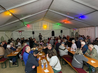 Foto (Heinschke): Zelt mit Besuchern beim Weiler Herbstfest 2025, im Hintergrund der Vor–Alb–Komödiant Thomas Schwarz, zur Veröffentlichung freigegeben.