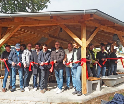 Besonders gefalle ihm, dass niemand hervorgehoben werde. Weder der Ortschaftsrat Nassachtal-Diegelsberg, der das Vorhaben tatkräftig unterstützt habe, noch der Gemeinderat, der die Finanzierung in Höhe von 40.000 Euro und den Bau des Pavillons durch den städtischen Bauhof beschlossen habe, noch ein einzelnes Dorf. „Die Wappen von allen Stadtteilen sind zu sehen, sogar von der Stadt Uhingen. Der Schaukohlenmeiler ist ein Symbol für die Gemeinschaft im Nassachtal“, führte Mattias Wittlinger weiter aus, „dass man zusammenwächst – und das im Jubiläumsjahr der Stadt Uhingen!“