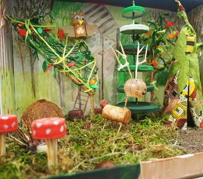 Luise Männer hat sehr fantasievoll für die szenische Umsetzung des Wald-Ferientages Materialien aus dem Haushalt verwendet. Aus Deckeln von Flaschen oder Gläsern bastelte sie Pflanzen wie Bäume und Fliegenpilze; aus Korken Reh und Eule. „Kreativ sind auch die Hintergrundzeichnungen und die Gestaltung der Bäume“, lobt Sabine Herwig und betont mit Blick auf die Kinder, die diesmal nicht gewonnen haben: „Vielleicht klappt es ja nächstes Jahr mit dem Gewinn bei unserem Kreativ-Wettbewerb!“