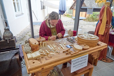 Das Alamannen-Forum stellt immer wieder besondere Punkte aus dem Leben der Alamannen vor und macht diese für die Gäste des Museums erlebbar. In diesem Jahr war das besondere Thema, wie die Alamannen ihre Gegenstände von Kleidung über Waffen und Exportartikel herstellten. Am Eingang und im Bereich der Museumscafeteria konnten die Alamanni und ihre Freunde ihre Gäste begrüßen. Felix Hallmann hatte Waffen und verschiedene Gefäße dabei. Eva Böttcher hatte ihre Schmucksammlung dabei und zeigte den Besuchern, wie schick und schön die Damen damals geschmückt waren. Nebenbei nähte sie noch Kissen und anderen Hausrat. Ulf Böttcher stellte Ringe für einen Ringpanzer her und verarbeitete diese an seinem Ringpanzer. Dem Laien ist der Ringpanzer als Kettenhemd bekannt. Daniel Kollmus hatte seine Ausrüstung zum „Horkheimer Reiter“ dabei, die besonders bei den Kindern auf großes Interesse stieß. Jan Hohenberger zeigte Knochen-Arbeiten aus der spätrömischen bis zur Merowingerzeit. Jürgen Heinritz gab den Besuchern einen Einblick in das Luxusleben in der Alamannenzeit und an beiden Tagen gab es eine biographische Familienführung mit ihm durch die Ausstellung des Museums. Antje Poppitz gab einen Einblick, wie man zu einer Darstellung kommt und wie viel Recherche dazu nötig ist. Doro Braun-Zeuner hatte ihre Färbesachen mitgebracht. Es gab tolle Einblicke, wie bunt das Leben zur Zeit der Alamannen war und wie die bunten Farben erreicht wurden. Nebenbei webte sie Bänder mit Kammweben. Michel Zeuner unterstützte seine Frau und unterhielt die Gäste mit seiner Leier. Esther Schneller zeigte das Spinnen mit einer Handspindel. Daniela Bittner vervollständigte den Textilbereich mit Brettchenweben. Hier durften Interessierte auch die Technik ausprobieren.