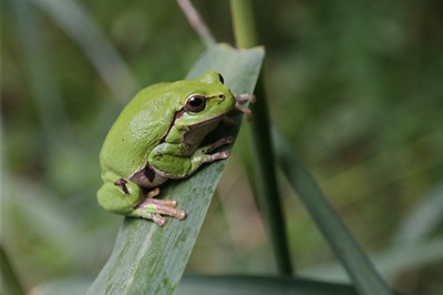 Der Europäische Laubfrosch (Hyla arborea) ist der einzige Baumfrosch hierzulande. Mit seinen Saugnäpfen an Finger- und Zehenspitzen kann er Baumwipfel in über 20 Meter erreichen. Seine bevorzugte Beute jagt er mit der klebrigen Zunge: Käfer, Spinnen und Fliegen. Die typische grüne Färbung mit dem dunklen Flankenstreif sowie die lautstarken Rufe zur Paarungszeit im Schutz der Nacht machen die Froschart unverwechselbar. Laubfrösche sind zugleich die kleinste Art unserer heimischen Frösche: zwischen drei bis fünf Zentimeter und nicht mehr als sechs Gramm wiegend, können sie in ihren Habitaten leicht übersehen werden.