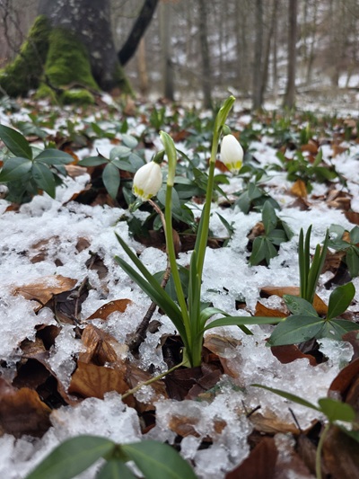 Die Märzenbecherblüte im Autal bei Bad Überkingen beginnt langsam und die ersten Blüten sind bereits zu sehen. Obwohl an manchen Stellen noch Schnee liegt, zeigen sich vereinzelt die ersten Märzenbecher. Mit zunehmender Sonneneinstrahlung werden nach und nach weitere Blüten folgen.