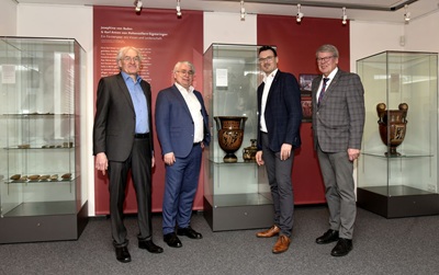 Foto (Alamannenmuseum Ellwangen, Ursula Maier): Die Sonderausstellung „Leidenschaft und Forschung * Die archäologische Sammlung Hohenzollern“ wurde am Donnerstag im Alamannenmuseum eröffnet. Das Bild zeigt vor den ausgestellten apulischen Vasen der Sammlung Hohenzollern: Museumsleiter Andreas Gut, Dr. Klaus Georg Kokkotidis vom Landesmuseum Württemberg in Stuttgart, Oberbürgermeister Michael Dambacher sowie den Vorsitzenden des Fördervereins Alamannenmuseum Ellwangen, Werner Kowarsch (von links)