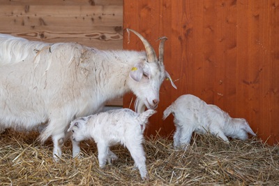 Die kleinen Ziegen präsentieren sich bereits wenige Tage nach der Geburt aufmerksam und neugierig. Beide Zicklein haben ein dichtes, weißes Fell. Wie für Ziegen typisch, folgen sie ihren Müttern eng und erkunden zunehmend eigenständig ihre Umgebung, wobei sie spielerisch ihre Koordination und Trittsicherheit entwickeln.