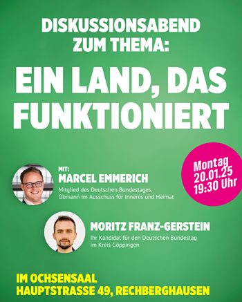 Eine Reform der Schuldenbremse gehört Franz-Gerstein zufolge dazu, die Linderung des Fachkräftemangels durch Aktivierung und Integration von Menschen, eine sogenannte Deutschland-App und vieles andere mehr. Mit dem Diskussionsabend beginnt auch die neue Reihe „Meet and Green – Austausch mit uns Grünen“ des Ortsverbandes Östlicher Schurwald.