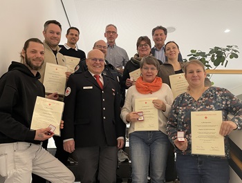 Mit rotfruchtigem Prisecco aus einer regionalen Manufaktur, individuellen Präsenten entsprechend der Ehrungsstufe und der Anstecknadel nebst Urkunde bedankten sich OB Klaus Heininger und der 1. Vorsitzende des DRK-Ortsvereins, Thomas Ruckh, bei jedem Blutspender persönlich. Geehrt wurden für 10 Blutspenden Angela Allmendinger, Monique Buschmann, Canan Dagli, Andreas Dangel, Stefanie Hohloch, Marc Kühfuß, Michael Pietsch und Manuel Reinhardt. Eine Ehrung für 25 Blutspenden erhielten Tobias Kaißer, Günther Mann und Andrea Seifried. Horst Gerlach, Thomas Martz und Ingrun Schurr wurden für 50 Blutspenden ausgezeichnet. Rolf Bayer leistete die höchste Anzahl mit 75 Blutspenden. Den Blutspenderinnen und Blutspendern, die am Ehrungsabend verhindert waren, werden die Ehrungsgaben nachgereicht. Der Dank des Oberbürgermeisters galt aber auch dem DRK-Ortsverein, der die Blutspendeaktionen zusammen mit dem mobilen Blutspendedienst in der Stadthalle fünf Mal im Jahr vorbildlich organisiert. Das sei ein Kraftakt, betonte das Stadtoberhaupt. „In Eislingen sind die Blutspende-Termine grundsätzlich gut besucht“, freute sich Thomas Ruckh. Dennoch bräuchte es noch deutlich mehr Spenden, um die Versorgung mit Blutpräparaten langfristig zu sichern. Das Online-Buchungssystem für die Blutspendeaktionen hat sich bewährt, denn dadurch verkürze sich die Wartezeit. Leider gibt es immer noch Menschen, die ihren gebuchten Termin nicht wahrnehmen und sich auch nicht abmelden. In diesem Fall würde er sich wünschen, dass der Termin unbedingt wieder storniert werde, um anderen die Chance auf einen Wunschtermin zu geben. Im Anschluss an den formellen Teil der Ehrung wurde es gesellig und kulinarisch. Mit einem Imbiss, mit Filmbeiträgen zur Verwendung des Spenderbluts und der Demonstration einer Reanimation an einer Übungspuppe gestalteten der DRK-Vorsitzende, Thomas Ruckh und Bereitschaftsleiter Rüdiger Trautmann ein interessantes und unterhaltsames Rahmenprogramm.