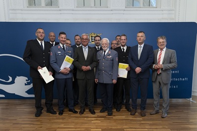 Foto (Innenministerium Baden-Württemberg / Leif Piechowski): v.l.n.r.: Markus Arnold, Steffen Kwiatkowski, Alexander Baur, Uwe Pawlitschko, Tobias Vester, Innenminister Thomas Strobl, Philipp Damm, Edmund Baur, Michael Schilling, Ralf Kreidenweiß, Christian Bruchner, Andreas Aschbacher, Ulli Hockenberger MdL