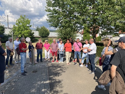 Dritte und letzte Station dann die neue Ortsmitte, die frühere Heimat der Firma Neuburger. Werner Staudenmayer hatte sich genauestens vorbereitet. Hümeyra Mrazic hatte für anschauliche Bilder gesorgt. Der Gemeinderat erzählte von den Anfängen 1855 der Tuchfabrik Borst, und dem Übergang zu Borst’s Erben um Max Neuburger aus Ulm. Die einzige jüdische Familie im Ort verlor 1938 die Fabrik durch ‚Zwangs-Arisierung‘ und konnte noch nach New York auswandern. Von dort aus übernahmen sie nach dem Ende der Nazi-Diktatur wieder ihr Eigentum. Die Kunstlederproduktion gewann an Bedeutung. Die mitten im Ort mit Schornstein, Kohlebunker, Mühlkanal und Produktionsgebäuden dominante Firma ging dann als Zweigwerk an die Eislinger Kaliko bzw ‚Conti AG‘. Bereits 1970 kaufte die Gemeinde das Areal als Flächenreserve und im Übergang zu den 80ern entstand die ‚neue Mitte‘ mit Marktplatz, Wohnungen, Geschäften und einem Anlagensee.