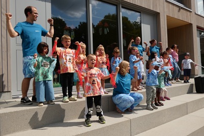 Der Festakt begann mit herzlichen Begrüßungsworten durch den Leiter der Kita, Gerald Heinrich. „Einen Ort des Wachsens, Entdeckens und der Geborgenheit“, würdigte Oliver Marzian, Fachbereichsleiter Soziales, die Bedeutung der Räume für die Entwicklung der Kinder. Als Geschenk überreichte er der Kita Stapelsteine, die den Kindern viele Möglichkeiten zur Entfaltung bieten können. Die Kinder und Erzieherinnen und Erzieher begeisterten die Gäste mit einem eigens komponierten Täleshüpfer-Lied, das fröhlich und mitreißend die neue Kita feierte. Ein besonderer Programmpunkt war das liebevoll inszeniertes Puppentheaterstück der Mitarbeitenden in dem es um die spannende Frage ging „Was hat die Bohnensuppe mit den Elementen zu tun“ -ein Vergnügen für Groß und Klein.