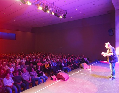 Markus Zipperle schwätzt im Uditorium vor etwa 400 Menschen „über älles – auch über Uhingen“. In fast 3 Stunden verrät er, wo man in Uhingen jemanden verschwinden lassen kann, trällert von der „Perle im Filstalland“ und lobt die Auftritte in Uhingen.