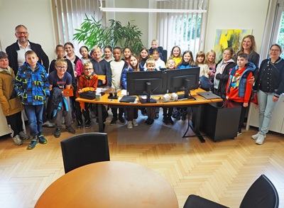 Foto (Stadt Uhingen): 24 Jungen und Mädchen der Klasse 4c haben sich mit Lehrerin Lea Appel (zweite von rechts) und der Pädagogischen Assistentin Mechtild Veil (rechts) von der Hieberschule auf den Weg ins Rathaus gemacht. Dort trafen sie Bürgermeister Matthias Wittlinger (links) und überraschten ihn mit interessanten Fragen zum Leben in Uhingen.