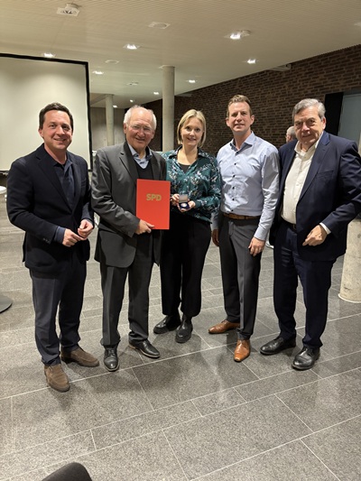 Den feierlichen Abschluss bildete die Verleihung der Willy-Brandt-Medaille, eine der höchsten Auszeichnungen der SPD. Überreicht wurde sie gemeinsam von Sabrina Hartmann (Kreisvorsitzende), Andre Knaus (Ortsvereinsvorsitzender), Sascha Binder (Generalsekretär, MdL) und Siegmar Mosdorf. Die Ehrung würdigt Hofelichs langjähriges Engagement, seine politische Haltung und seine Verdienste um die Sozialdemokratie in Baden-Württemberg. Peter Hofelich dankte in ihm eigener Art durch einige wenige Anekdoten, die seinen bisherigen beruflichen und politischen Weg ebenso humorig wie nachdenklich beschrieben. Der Abend klang danach bis in die späten Stunden bei guten Gesprächen im Foyer der Stauferlandhalle aus.