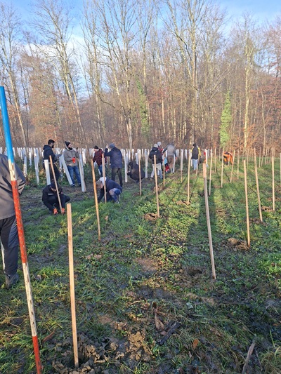 Gemeinsam mit rund 20 Bürgerinnen und Bürgern ging es ans Pflanzen der jungen Setzlinge. So fanden rund 500 kleine Bäumchen einen neuen Platz zum Wachsen. Insgesamt sind nun im Zeitraum von 2023 bis 2025 etwa 2000 Bäume auf einer rund ein Hektar großen Fläche gepflanzt worden. Sie symbolisieren die jeweiligen Geburtenjahrgänge der Stadt Göppingen.