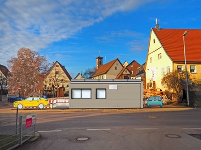 An gleicher Stelle errichtet die Stadt Uhingen einen eingeschossigen Container-Neubau mit einer Fassade in Holzoptik, der auch Auswirkungen auf den in Sparwiesen angebotenen Bürgerservice hat. Denn die Verwaltungsstelle soll vom Gestöckweg in den Neubau umziehen. „Es ist uns wichtig, den Bürgerservice in Sparwiesen weiterhin anbieten zu können“, betont Uhingens Bürgermeister Matthias Wittlinger. Der Umzug bringe gleich mehrere Vorteile mit sich: Es gibt wesentlich mehr Parkmöglichkeiten, die zentralere Lage und somit bessere Erreichbarkeit und die Ausgaben für die Miete der Räume im Gestöckweg fallen weg.