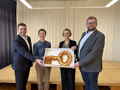 „Gute Bildung braucht auch ein gutes Umfeld. Ich freue mich sehr, dass die Schiller-Grundschule nun wieder in neuem Glanz erstrahlt und der verbesserte Brandschutz für mehr Sicherheit sorgt“, sagt Oberbürgermeister Alex Maier bei der kleinen Feier. Gemeinsam mit Erstem Bürgermeister Johannes Heberle und Baubürgermeisterin Eva Noller übergab er symbolisch einen Hefezopf-Schlüssel an Schulleiterin Melanie Mühlberger.