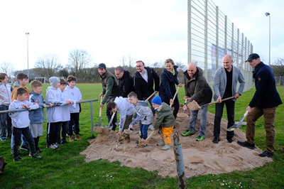 Foto (Stadt Göppingen): Bald entsteht an dieser Stelle ein Kunstrasenplatz. An den Spaten sind Baubürgermeisterin Eva Noller, Vereinsvorstand Martin Quintus (2 v.r.) sowie weitere am Projekt beteiligte Gäste.