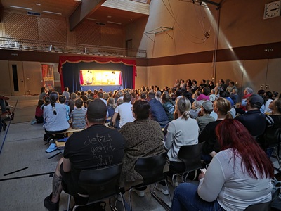 Zahlreiche Familien mit Kindern verfolgten die rund einstündige Vorstellung mit großer Aufmerksamkeit. Besonders erfreulich war die lebendige Beteiligung der jungen Zuschauer/-innen, die das Geschehen auf der Bühne immer wieder mit Rückfragen, Kommentaren und Zwischenrufen begleiteten.