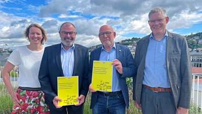 Foto von links: Yvonne Hüneburg, Geschäftsführerin WBO, Franz Schweizer, Präsident WBO, Verkehrsminister Winfried Hermann, Ulrich Weber, Geschäftsführer VDV Baden-Württemberg.