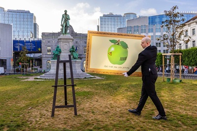 Direkt vor dem Europäischen Parlament in Brüssel enthüllten wir eine surreale Kunstinstallation, die von dem belgischen Künstler Magritte inspiriert ist. Die Botschaft: Was wie ein Apfel, ein Bauernhof oder sogar ein Bauer aussieht… ist keiner. Nicht mehr.