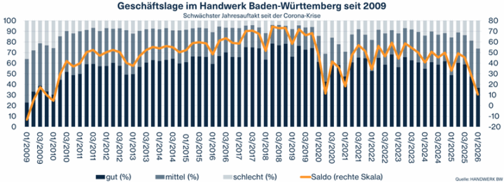 Die wirtschaftliche Lage im baden-württembergischen Handwerk hat sich zum Jahresbeginn 2026 deutlich eingetrübt. So schlecht wurde die Geschäftslage zuletzt während der Corona-Pandemie bewertet – entsprechend hoch sind die Erwartungen des Handwerks an die aktuelle Wirtschaftspolitik.